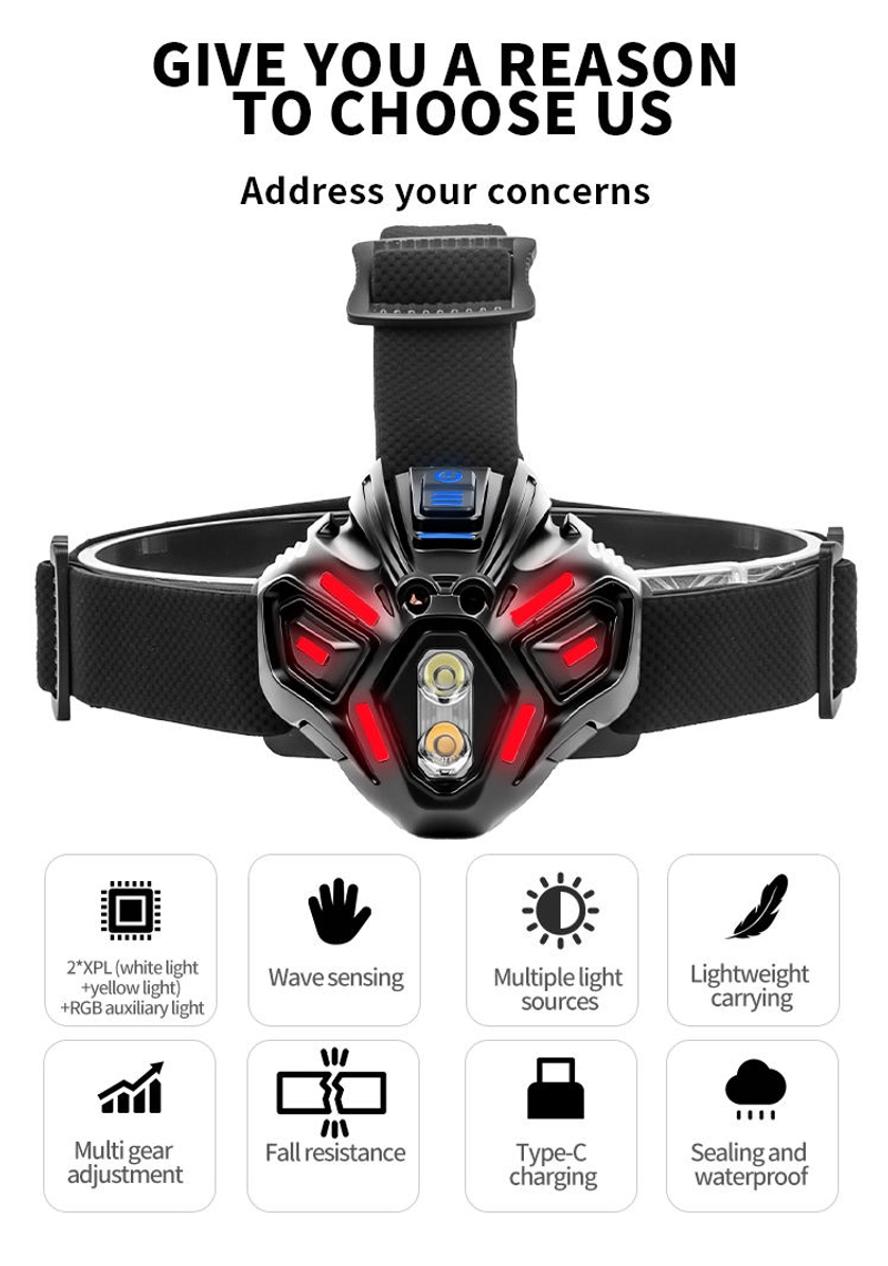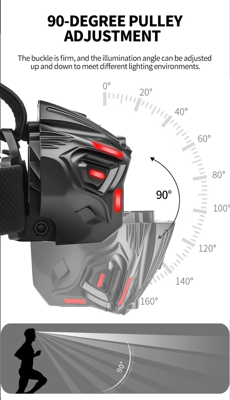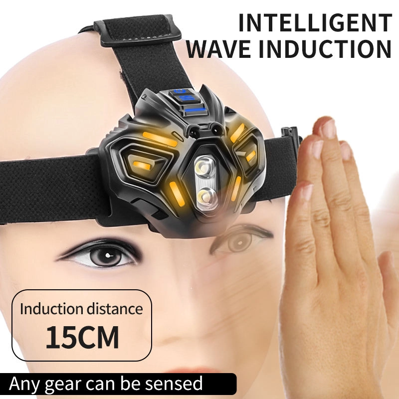 Farol com sensor de movimento USB tipo C Carregamento rápido 16 modos Bateria poderosa de lanterna de farol para acampamento ao ar livre